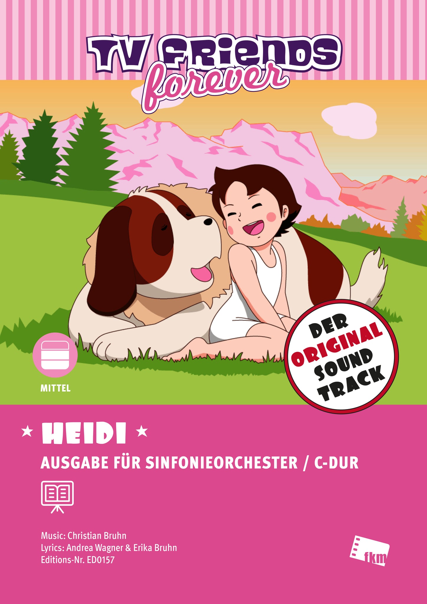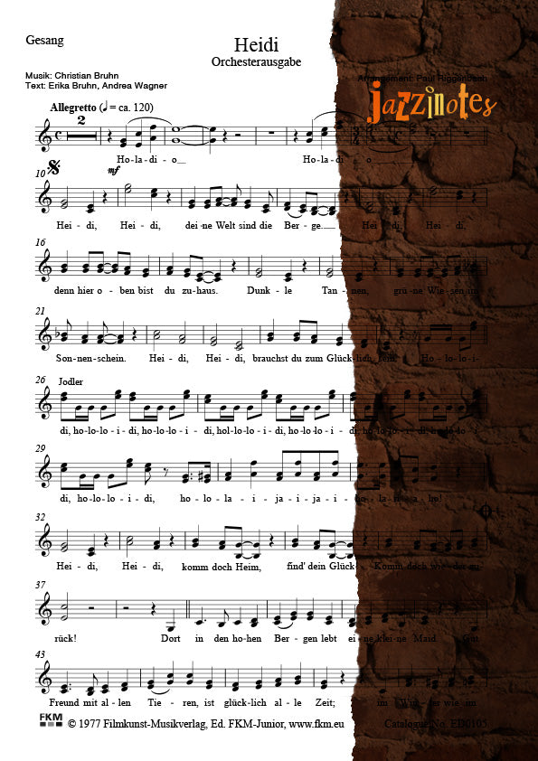 Heidi ist eine Anime, also ein japanisch produzierter Animationsfilm/Zeichentrickfilm aus dem Jahr 1974. Er basiert auf dem gleichnamigen Kinderroman der schweizerischen Schriftstellerin Johanna Spyri und erzählt die Geschichte des Waisenmädchens Heidi, die bei ihrem Großvater in den Schweizer Alpen lebt und zeitweilig in Frankfurt. Das Titellied der deutschsprachigen Fassung, gesungen von Gitti & Erika, ist Grundlage für das Orchesterarrangement von Paul Riggenbach, das im Auftrag des Filmkunst-Musikverlags in München geschrieben wurde für Sinfonieorchester. Zentral für das Orchesterarrangement bleibt der zweistimmige Leadgesang. Der Ablauf entspricht der Filmversion, zu hören im YouTube-Video, das Sie oben hören können (klicken Sie auf den Pfeil).