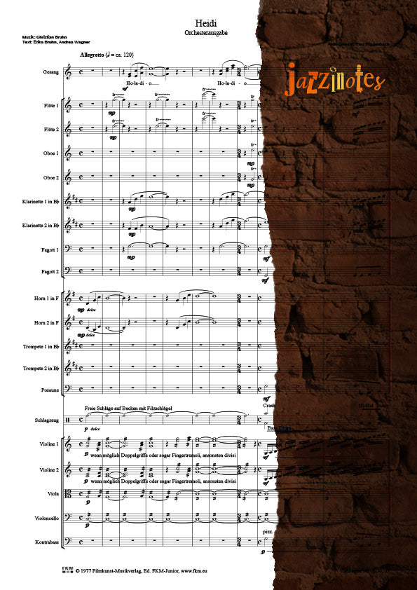 Kurzbeschreibung: Musiknoten als Arrangement für Sinfonieorchester des Titelsongs zur Filmmusik "Heidi" nahe der Originalaufnahme.