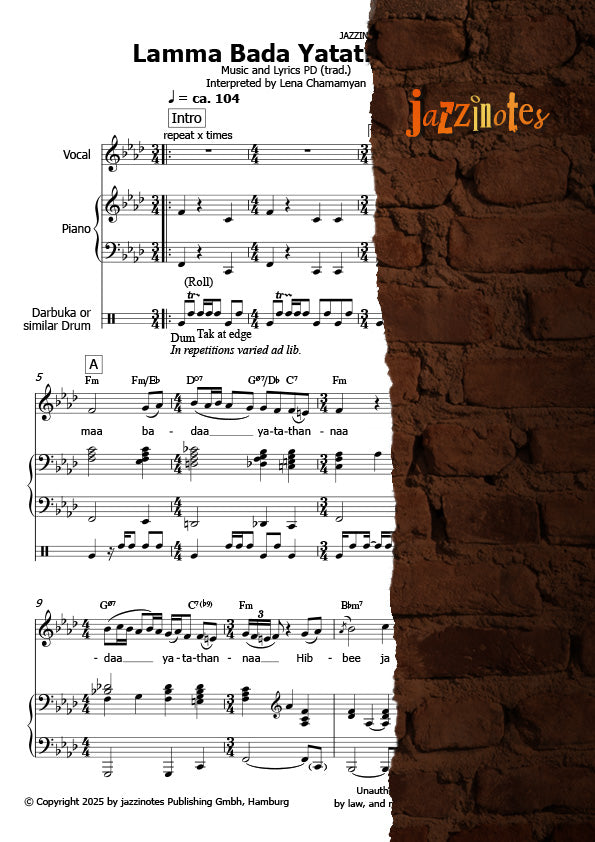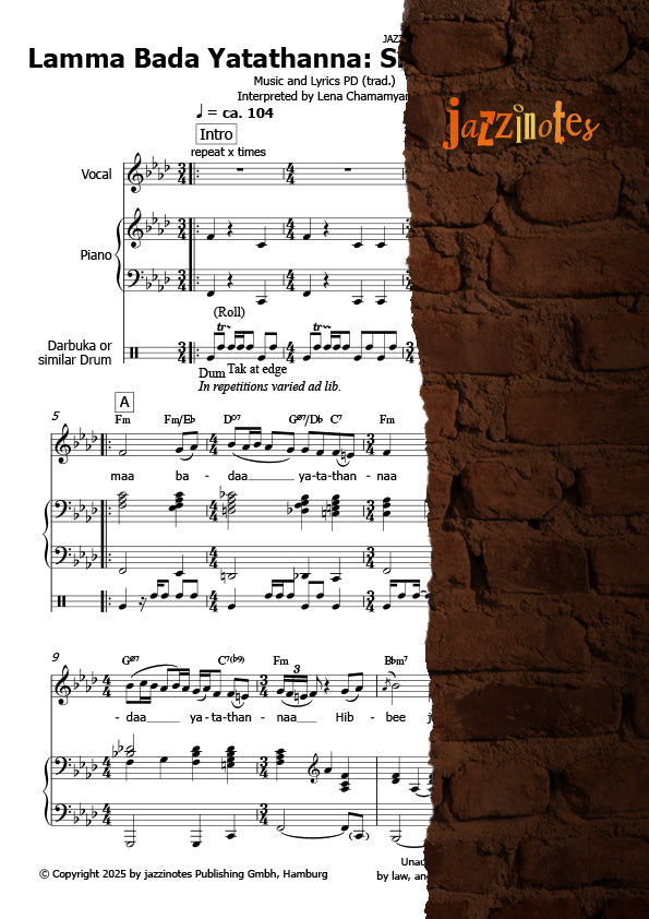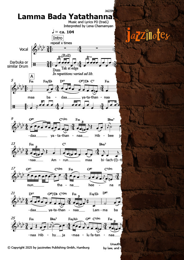 Lama Bada Yatathana (arabisch لما بدا يتثنى, auch Lamma Bada Yatathanna oder Lamma Bada Yatathana genannt) ist ein Muwaschschah (arab. موشح), ein arabisch-andalusisches Lied in Strophengedichtform (charakteristisches mehrstrophiges Gedicht mit Endreim und Kehrreim) mit der Skala (Maqam, arabisch مقام) Nehawand, die sehr ähnlich dem europäischen Harmonisch-Moll ist (mit dem charakteristischen 1 1/2-Tonschritt zwischen Stufe 6 und 7). Wohl deshalb klingen die europäischen Harmonien, gespielt auf dem wohltemperiert gestimmten Klavier, so organisch, obwohl die arabische Musik eigentlich unkomplatibel mit den europäischen Harmonien scheint. Das Lied stammt aus Andalusien in der Zeit, als es von Mauren beherrscht war. Wahrscheinlich ist es zur Zeit des Kalifats von Cordoba (929-1031) oder spätestens während des Emirats von Granada (1238-1492) entstanden. Es ist das weltweit vielleicht bekannteste arabische Lied. Charakteristisch ist das regelmäßig-unregelmäßige Metrum, das oft als 10/8-Takt notiert wird. In der jazzinotes-Ausgabe ist es notiert als wiederholte Folge von 3/4-, 4/4 und 3/4-Takt, in der Summe 10/4-Takt. Den Text (sowohl arabisch als auch mit lateinischer Lautschrift) mit der Übersetzung auf Englisch und Deutsch finden Sie in den Noten, ebenso eine Erklärung zu den drei abgedruckten Versionen: 1. Vollständige Originaltranksription (Note-for-Note), 2. vereinfachter Ablauf, 3. Lead Sheet (mit Text und Akkordsymbolen). Optional finden Sie auch die Grundpattern der Darbuka-Trommel, die natürlich auch mit einer ähnlichen Trommel gespielt werden kann.