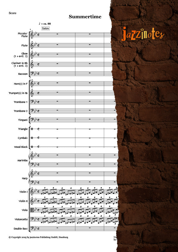 Kurzbeschreibung: Musiknoten als Arrangement für Orchester des Jazzklassikers Summertime von George Gershwin. Als Vorlage für das Arrangement diente die Interpretation von Charlie Parker with Strings. Die Soli sind von dort übernommen (Altsaxophon) und für die Orchesterfassung auf Trompete und Posaune übertragen und etwas angepasst worden. Wie immer bei Orchesterarrangements von jazzinotes ist die Instrumentierung sehr flexibel anpassbar.
