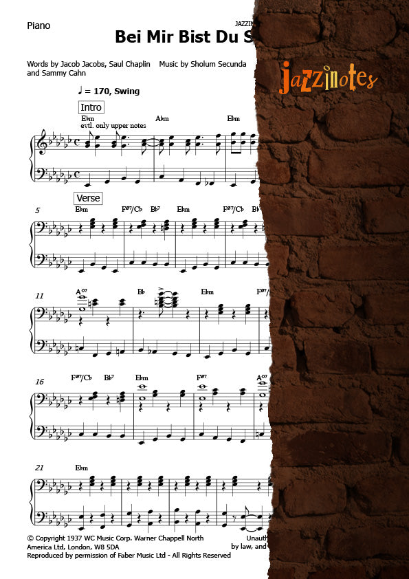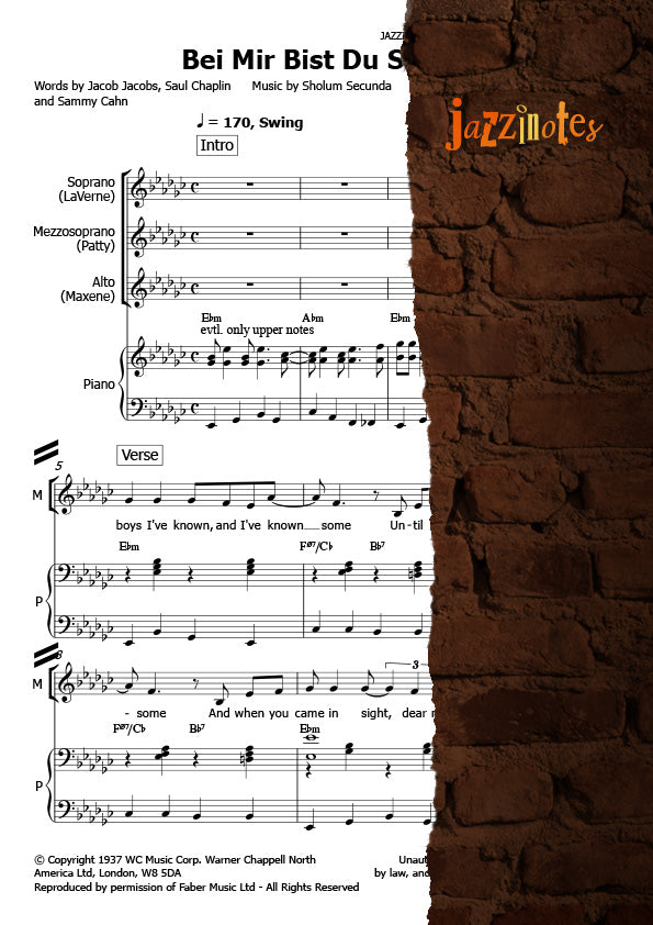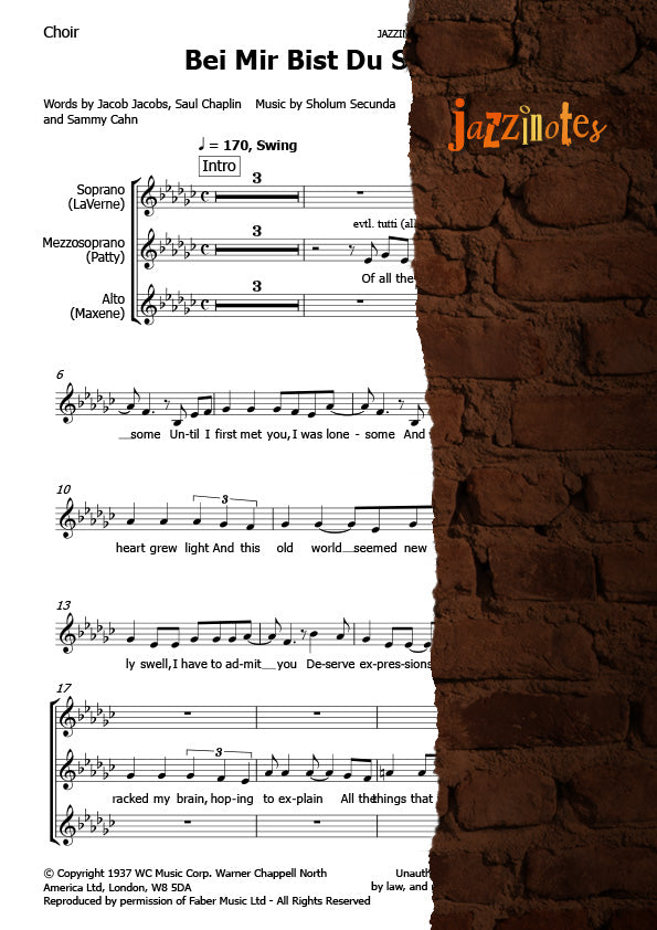Die Gesangsnoten des Stücks Bei mir bist du shein, das zum Merkenzeichen der Andrew Sisters und von ihnen mehrfach aufgenommen wurde, sind Note-for-Note transkribiert: Sopran (gesungen von LaVerne Andrew), Mezzopran (Paddy) und Alt (Mexene). Sie können auch von einem dreistimmigen Frauenchor gesungen werden (oder von einem dreistimmigen Männerchor). Das Klavier ist sehr nahe an der Originalaufnahme arrangiert (Band mit Bläsern). Ebenfalls berücksichtigt sind die Akkordsymbole und der Text. Das Stück stammt ursprünglich aus einem jiddischen Musical und trug den Titel Bei mir bistu shein, was in etwa "Ich finde dich hübsch" bedeutet. Das Musical wurde von Sholom Secunda komponiert und von Jacob Jacobs getextet. 1932 wurde es im New Yorker Rolland Theater uraufgeführt. Sammy Cahn und Saul Chaplin erwarben die Rechte und schrieben das Stück grundlegend um. Insbesondere wurde der Text ins Englische übertragen. Die erste kommerziell genutzte Aufnahme stammt vom damals noch unbekannten Gesangstrio The Andrew Sisters, das den Song 1937 mit dem Orchester von Vic Schoen aufnahm. Weil es als kommerziell nicht sehr erfolgreich eingstuft wurde, kam das Lied vorerst auf der B-Seite einer Single unter. Doch Radiosendungen machten das Stück schnell bekannt, so dass es 1938 zum No1-Hit der Billboardcharts aufstieg und dies fünf Wochen lang blieb. Es machte die Andrew Sisters schlagartig berühmt und wurde zu deren Erkennungssong. Später wurde es oft gecovert, u.a. von Lionel Hampten, Ella Fitzgerald, Glenn Miller, Max Raabe, Bette Midler, Isaac & Nora und vielen anderen. Sogar in Nazideutschland wurde das Lied gespielt, u.a. von Teddy Stauffer. Berühmt geworden ist auch die Interpretation von Zarah Leander, aufgenommen in Schweden im Jahr 1938.